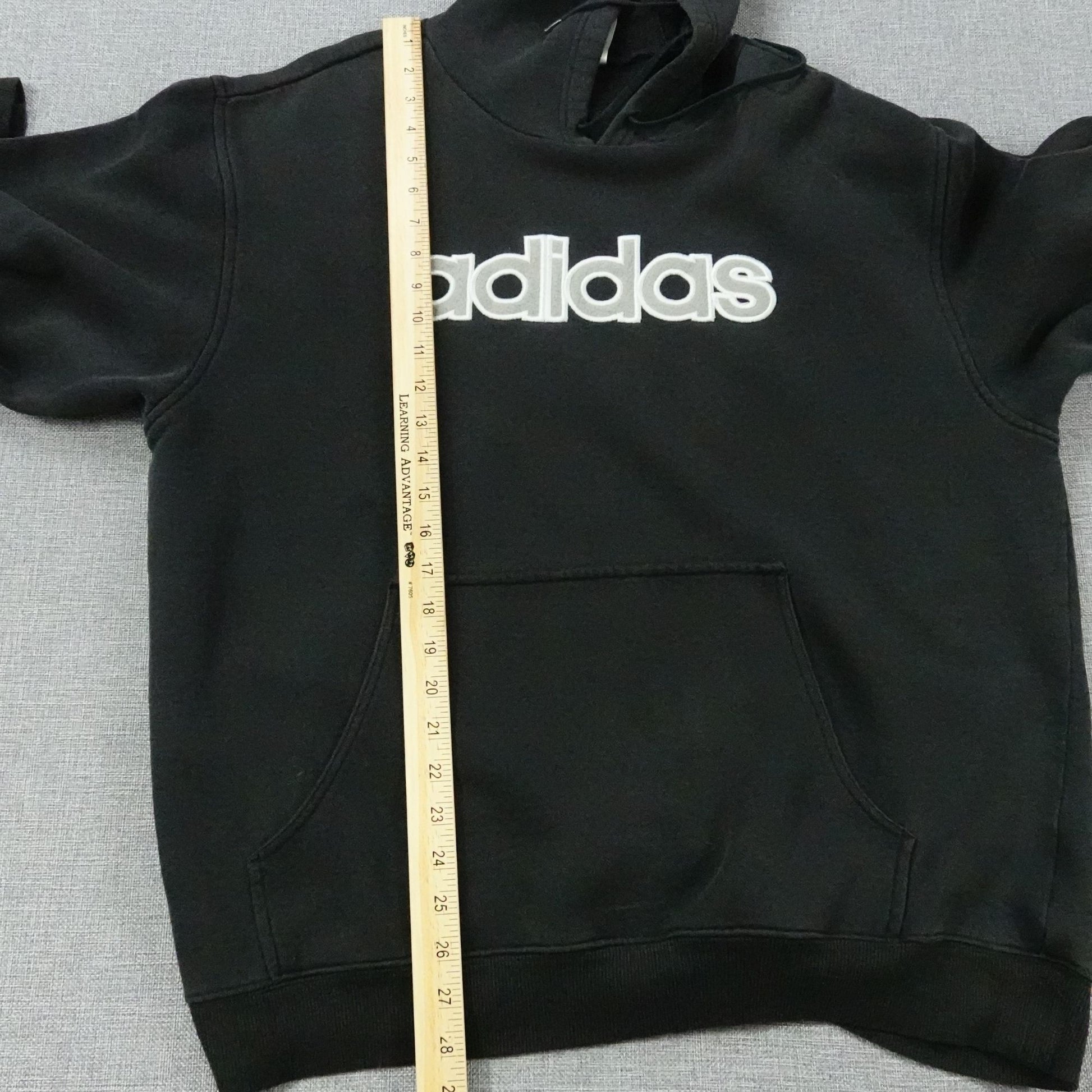 Classic and bold, this Adidas men’s black hoodie showcases a large white embroidered spellout logo across the chest. Made from a comfortable cotton-blend fleece, it features a drawstring hood and kangaroo pocket. Perfect for everyday wear, streetwear looks, or layering in cooler seasons.