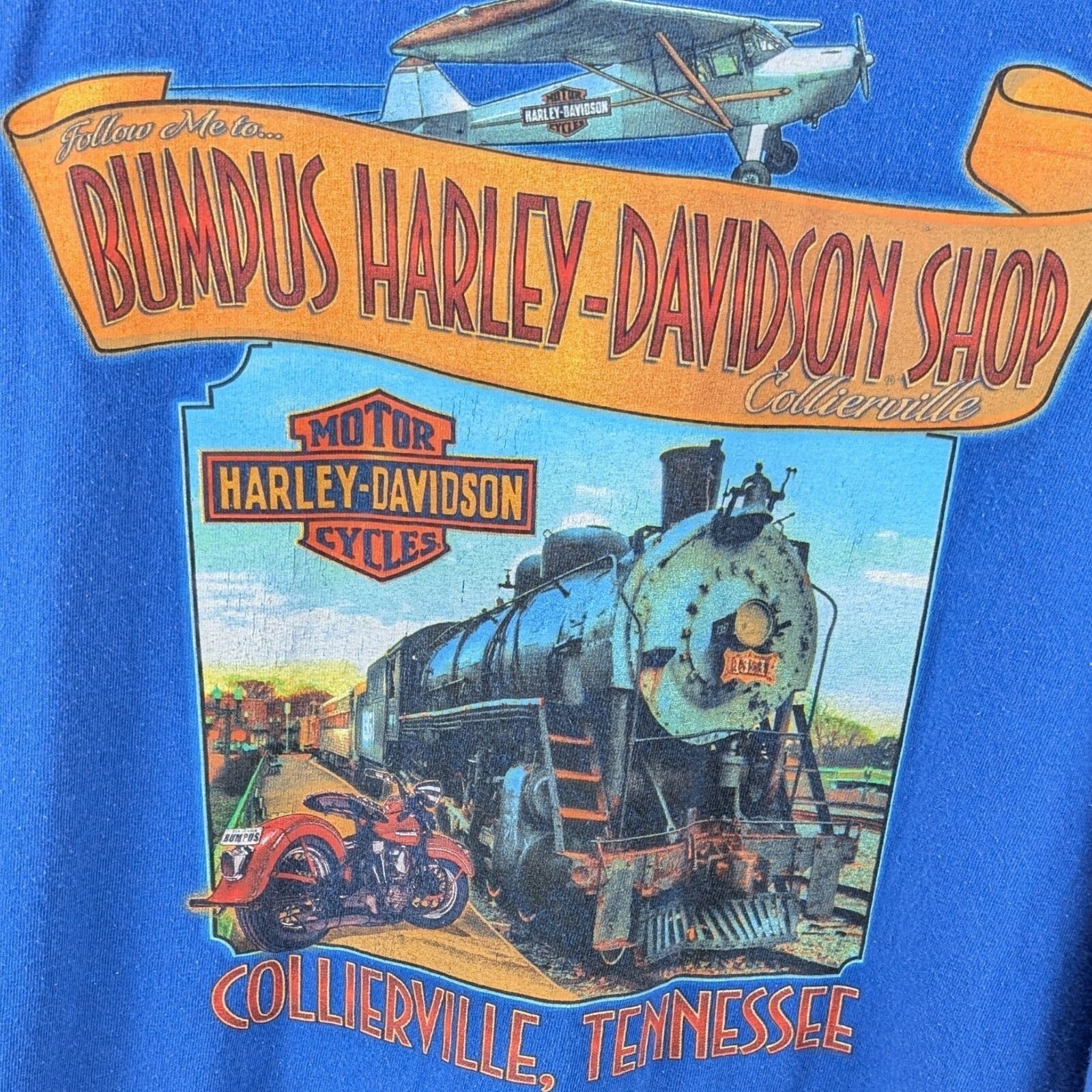 Bold and patriotic, this Harley-Davidson “Legends Never Die” t-shirt features a striking front skull graphic with wings, pistons, and a star-spangled helmet—true symbols of the open road. The back showcases detailed artwork from the Bumpus Harley-Davidson Shop in Collierville, TN, complete with a vintage train and motorcycle. A perfect collector’s piece or everyday wear for any Harley enthusiast.