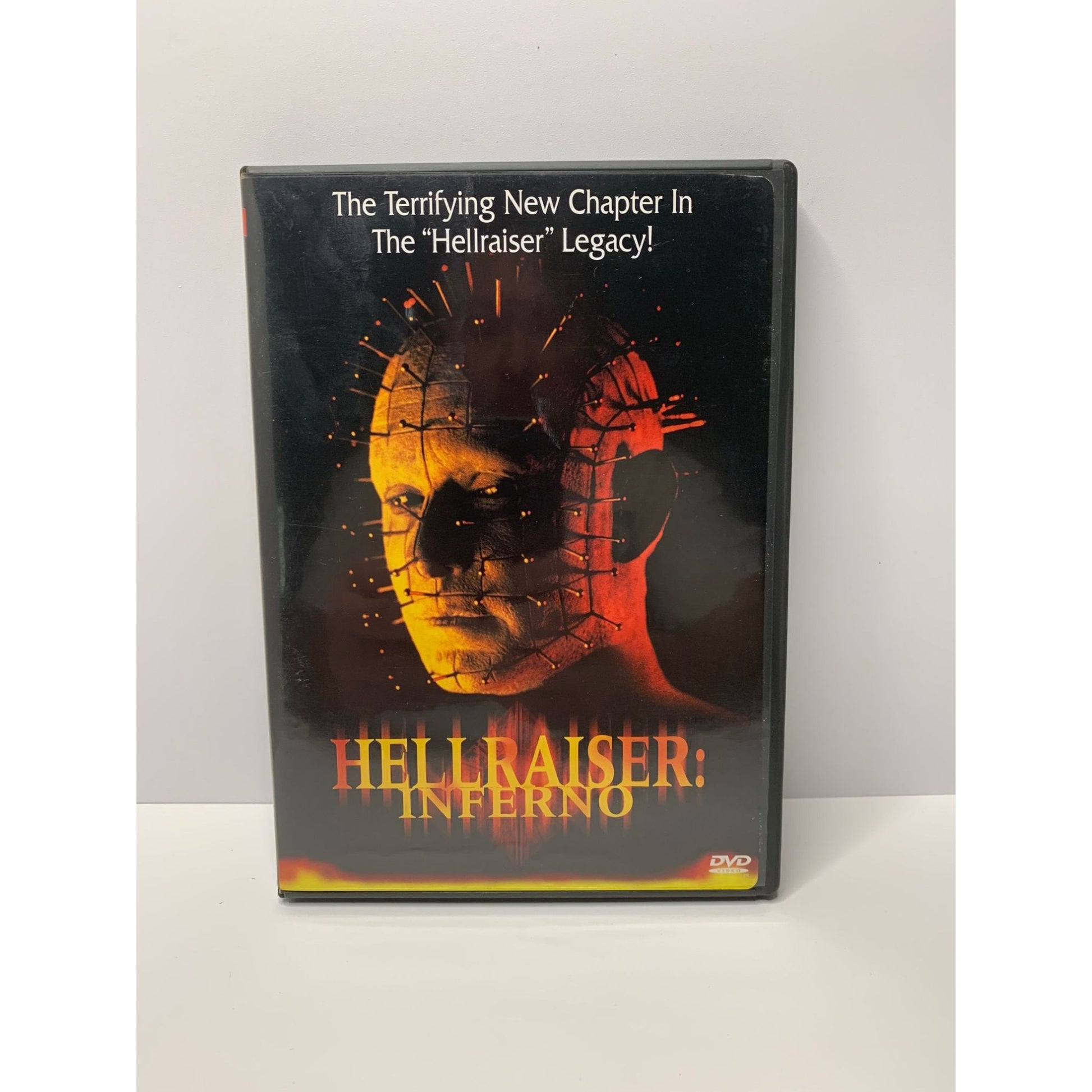 This is the DVD release of “Hellraiser: Inferno.” The disc has light surface scratches but has been tested and plays correctly. The case shows mild shelf wear yet remains clean and intact, and includes the original insert.