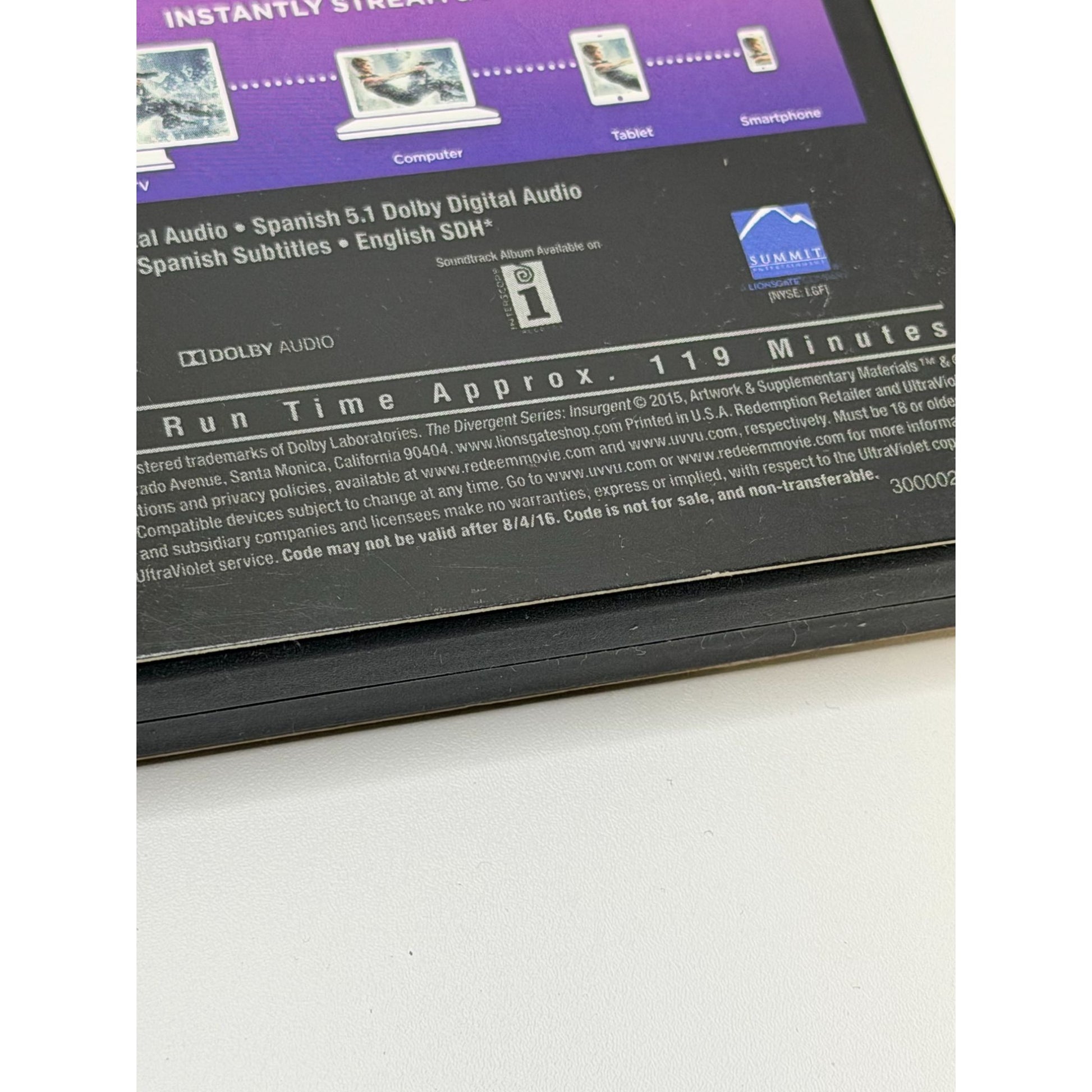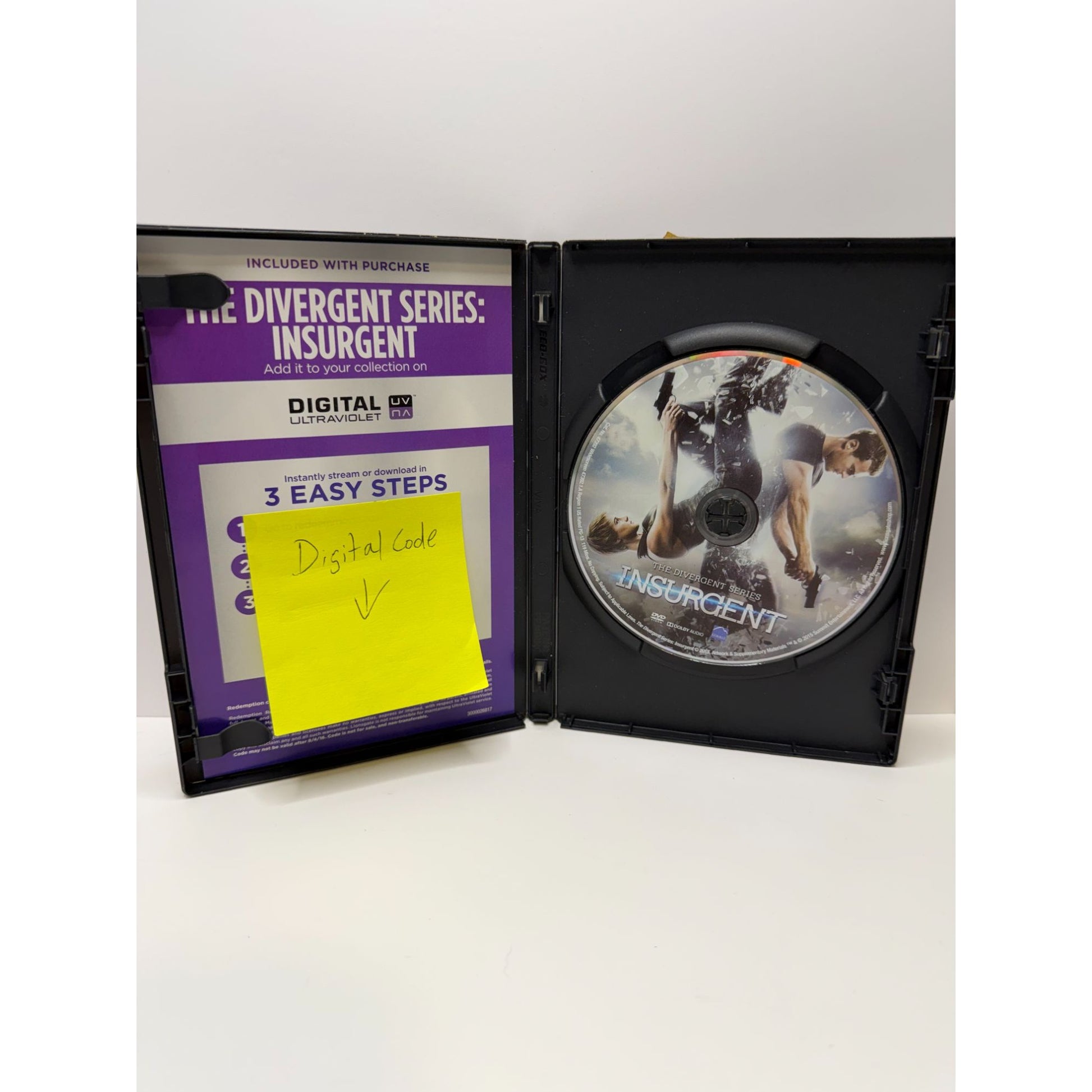 This is a DVD + Digital copy of “The Divergent Series: Insurgent” starring Shailene Woodley and Theo James. The disc has light scratches but has been tested and works properly. Case and slipcover show light general wear. Digital code is included but its validity is not confirmed.
