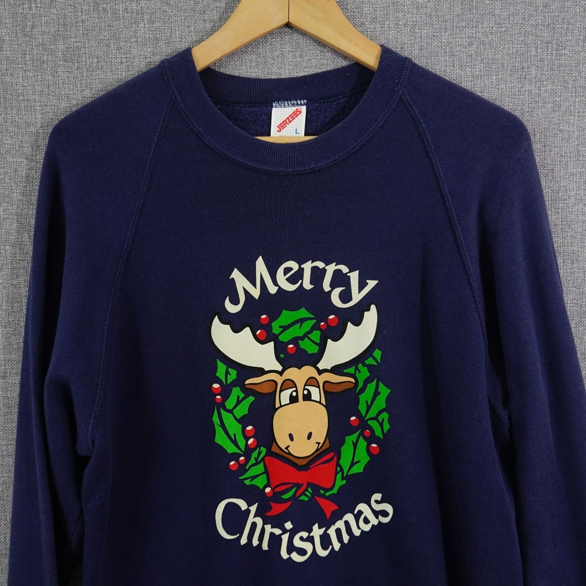 Get into the holiday spirit with this vintage Jerzees "Merry Christmas" sweatshirt featuring an adorable moose surrounded by holly. Made in the USA, this classic crewneck brings retro charm and festive cheer, perfect for ugly sweater parties or cozy winter lounging. Soft, warm, and full of nostalgia, this is a must-have holiday piece for vintage lovers.