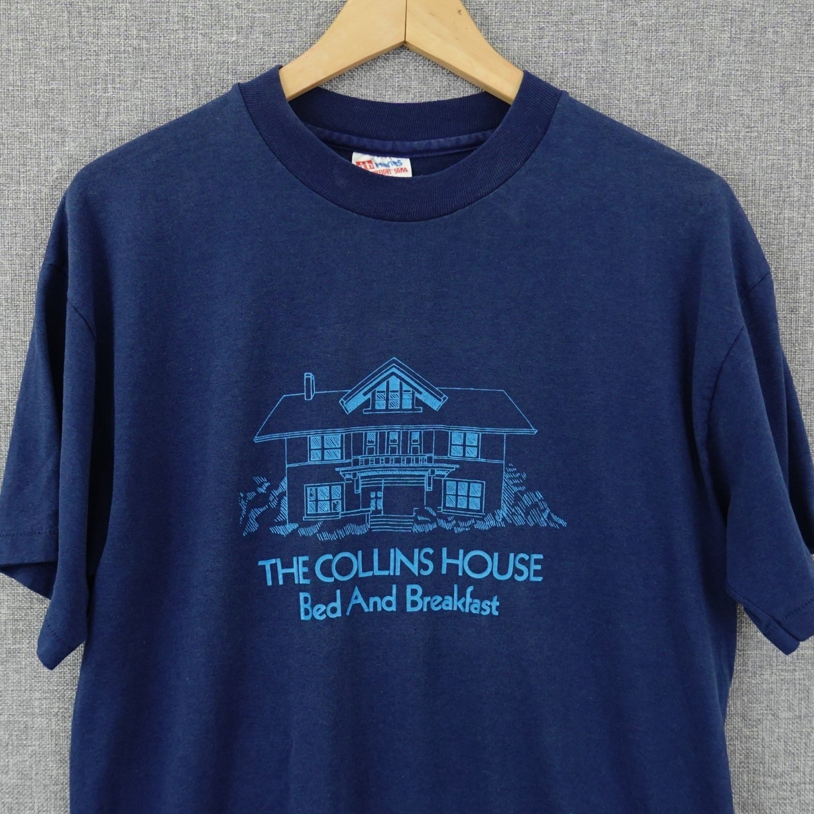 This vintage Hanes Heavyweight t-shirt highlights a nostalgic screen-printed graphic of The Collins House Bed and Breakfast. The soft 50/50 cotton-poly blend offers lasting comfort and a slightly worn-in feel, while the retro-style line art lends timeless Americana charm. Made in the USA, it's a classic addition to any vintage tee collection or travel-themed wardrobe.