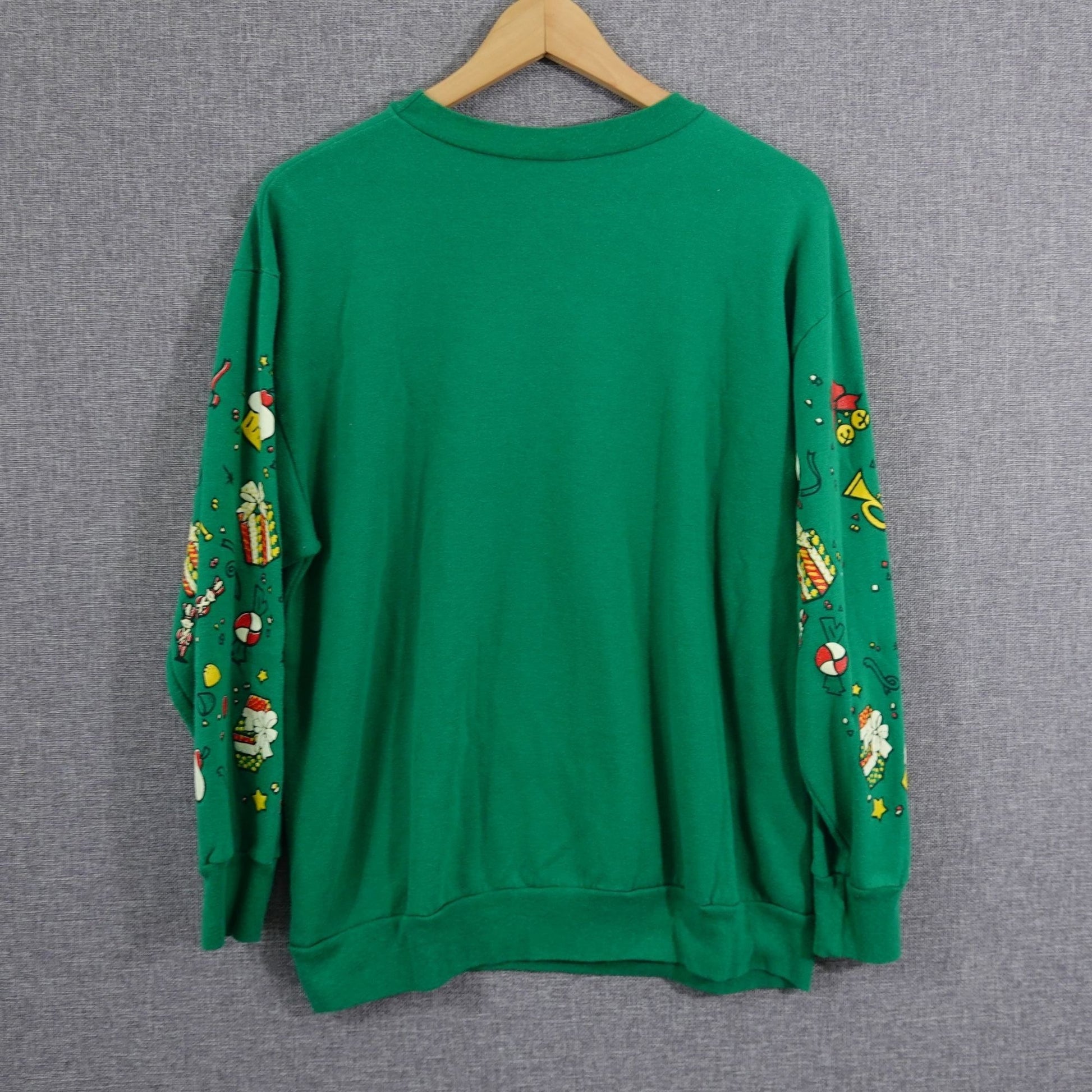 Get festive in this vintage Holiday Time Christmas sweatshirt! Featuring a delightfully tacky graphic print on a rich green base, this medium-fit crewneck is perfect for holiday parties or cozy winter lounging.